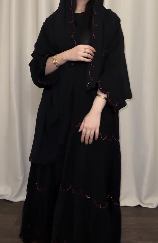 عبايه باللون الاسود مع شك يدوي باللون العنابي على الاكمام و وسط العبايه و طرف الطرحه
